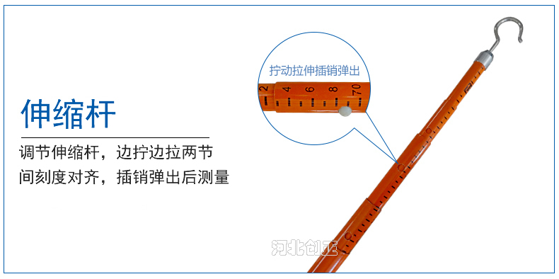 4、測量時,由內層絕緣桿向上抽起,每根絕緣桿的刻度對應外面一層絕緣桿的尺寸刻度,然后旋緊絕緣桿,測高桿的金屬掛鉤掛在高壓線路上,此時外側的絕緣桿上沿對齊抽起的絕緣桿的刻度;